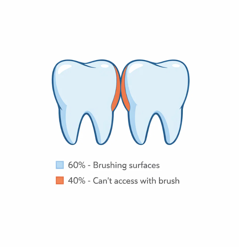 The remaining 40% lies between the teeth — known as interproximal surfaces. These areas are narrow, sheltered, and largely inaccessible to a toothbrush.